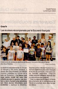La classe de CM1/CM2 avec leur professeur des écoles madame Sophie LE PORT (par ailleurs directrice) de l’école des deux rivières de Crac’h a participé une nouvelle fois au concours scolaire dont le thème pour cette année 2021-2022 était « les enfants dans la guerre ».  Pour rappel le concours est organisé en partenariat avec l’Office National des Anciens Combattants et Victimes de Guerre et en collaboration avec la Direction des Services Départementaux de l’Éducation Nationale du Morbihan.