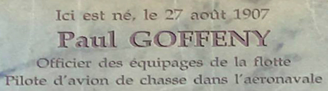 L’aviateur Paul GOFFENY est né à Carnac le 27 août 1907. Mort pour la France le 1er janvier 1945, il est tué au combat lors d’une mission d’attaque sur le front de l’Atlantique. Il était titulaire de la médaille militaire, de la croix de guerre 1939/1945 avec palmes et fait chevalier de la légion d’honneur.