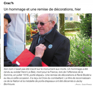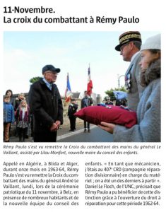 Article Ouest France :  Monsieur René DODET reçoit la carte du combattant