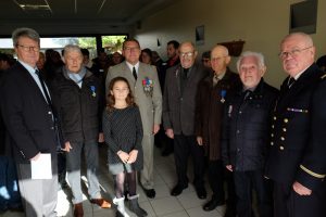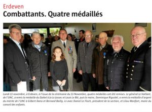 A l’issue de la cérémonie remise de la médaille du Djebel à Jo le JOSSEC et Louis LE BLÉ, et de la médaille d’argent de l’UNC à Gilbert DANO, Bernard BAILLY avec m.  RIGUIDEL maire et Lilou MONTFORT