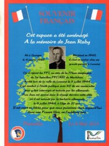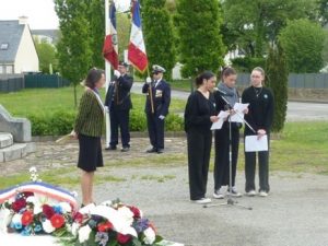 *A Lorient ,le comité était également mobilisé à la cérémonie du 8 mai présidée par le sous-préfet. *Au pays de Vilaine , le comité avec ses drapeaux était également mobilisé lors des cérémonies du 8 mai à Allaire, Billiers, Carmoel et Nivillac. *Au comité de la baie de Quiberon, ria d’Etel Cérémonie du 07 mai à Etel : Pour les 3 communes de Belz, Etel et Erdeven, la cérémonie commémorant la victoire de la seconde guerre mondiale se déroule à Etel le 07 mai en raison de la signature de la capitulation de la poche de Lorient dans le Bar Breton sur le port Le 8 mai Une cérémonie a eu lieu dans toutes les autres communes. A Crac’h, après un dépôt de gerbes devant la tombe de regroupement (14 Morts pour la France) dans le cimetière une participation active du conseil municipal des jeunes et des enfants de l’école des deux rivières avec leur directrice madame Sophie Le Port a été remarquée et appréciée *Au comité de St Jean Brevelay, à Plumelin, la cérémonie du 8 mai s’est déroulée devant la stèle d’un enfant du pays, FFI tué en 1944. Une plaque commémorative a été dévoilée par le maire et le président du comité. ***Samedi 13 mai, le comité Auray-Pluvigner recevait les représentants des différents comités pour la présentation par Daniel Le Marchand du fichier départemental des sépultures familiales des Morts pour la France, en cours de création, et l’intervention de Jean-Luc Bruzulier sur la méthodologie proposée pour la recherche de ces tombes. *Le samedi 13 mai, lors de la visite de deux membres de l’American Legion, revenus à Pluvigner avec leur petite-fille sur les lieux du crash du B-17 « Beats’Me » le comité Auray-Pluvigner a organisé, après un déjeuner en commun, une brève cérémonie sur le site aménagé et entretenu par le comité pour honorer la mémoire des 7 membres d’équipage morts le 23 janvier 1943. *Mardi 23 mai, le Délégué général et Mme Anne Geslin, directrice de l’ONaCVG, présidaient le jury départemental du concours commun du SF et des « Petits Artistes de la Mémoire ». Onze dossiers ont été évalués par les 9 membres du jury Le palmarès ne sera dévoilé que le vendredi 30 juin, lors de la remise des prix au Palais des Arts de Vannes. *Jeudi 26 mai à Vannes, dans le cadre de la remise des prix du concours national de la Résistance et de la Déportation, le Souvenir Français était largement représenté à la remise des prix et à la cérémonie qui s’est déroulée au plateau de La Garenne ***A VENIR