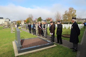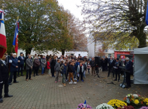 La cérémonie patriotique départementale suivait au plateau de la Garenne, présidée par le préfet entouré des autorités et élus. Sur les rangs, outre le drapeau et les unités du 3° Rima, un peloton d’élèves officiers de l’Ecole spéciale militaire et une section de cadets de la gendarmerie rendaient les honneurs aux morts. Après la lecture des messages, des enfants des écoles ont déposé les bougies du Souvenir Français avant le dépôt de gerbes au monument au morts (gerbe du S.F. déposée par le DG, le général Loeuillet). Belle cérémonie, empreinte de beaucoup de dignité avec une assistance étoffée et une participation remarquée des jeunes lecteurs et des classes ayant entonné « a capella » la Marseillaise, reprise par l’assistance.