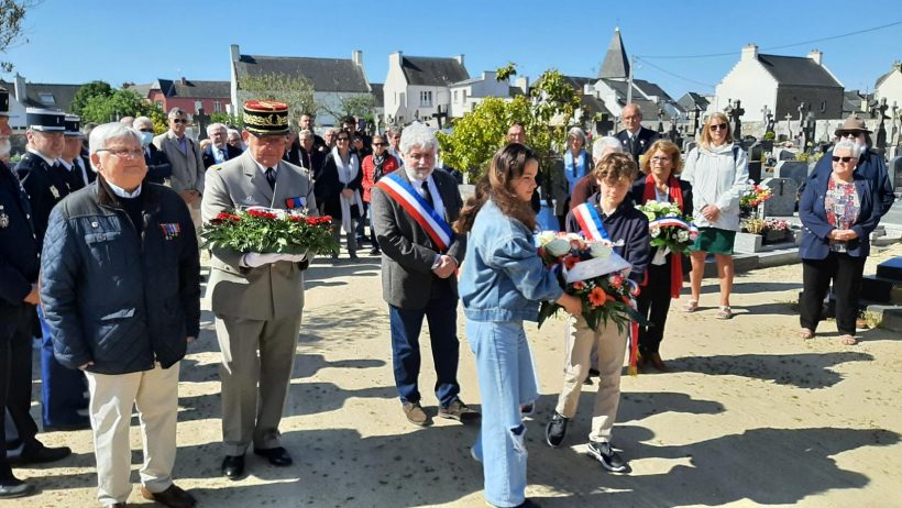 La cérémonie a débuté par une célébration liturgique à l’église par le père Marc Wilhelm. Les 9 porte-drapeaux dont Jo Le ROL, porte drapeau du comité, ont pris la tête du défilé pour une première partie de cérémonie devant le monument aux morts. Dépôt de gerbes, allocution du maire et lecture du message de madame Geneviève Darrieussecq Ministre déléguée auprès de la ministre des Armées, chargée de la Mémoire et des Anciens combattants, par les membres du conseil municipal des jeunes , lecture d’un texte par 3 jeunes du collège d’Etel ont rythmés cette partie de la cérémonie avant de se conclure par une remise de croix du combattant et le salut des drapeaux.
