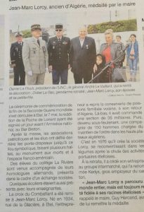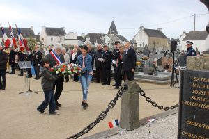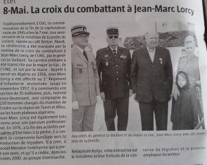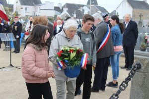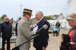 Présidée par M. Guy HERCEND maire d’Etel, en présence de m. Florence SEVENO et de m. Jean-Pierre MIGNANT adjoints d’Erdeven, de m. Philippe MIGNANT adjoint à Belz, en présence de huit drapeaux, la commémoration a débuté par une messe à l’église Notre Dame des Flots. Trois lieux symboliques marquent ensuite cet événement, le monument aux morts dans le cimetière, la stèle de l’espace franco-américain et l’emplacement (croisement de la rue de la libération et de la rue du 08 mai) du « Bar Breton » ou fut signé l’acte de capitulation de la poche de Lorient. J.L. ROGER, JC PANNETIER, Pierre COLLETER, Jo le ROL porte drapeau et André Le VAILLANT ont représenté le comité. Au cours de la cérémonie la croix du combattant a été remis à m. Jean-Marc LORCY.