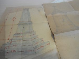 A gauche, croquis du monument aux morts.A droite, croquis du monument qui aurait pu être construit sur la tombe de regroupement. |
