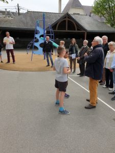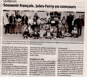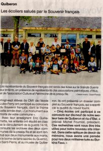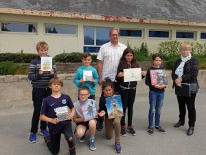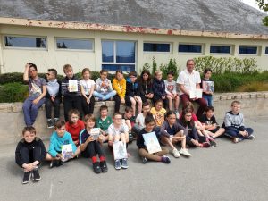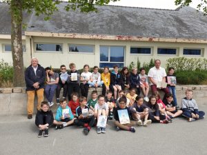 En présence de madame Maryvonne CORRIGNAN, adjointe au maire de Quiberon, en charge des affaires scolaires, de messieurs Elie COANTIC président de l’association culture et patrimoine, Alain DIDIES le secrétaire et Gildas GOUARIN trésorier, de Monsieur Jean-Pierre BOUTAUD, M. FOURNIOL président, accompagné par A. LE VAILLANT, M.C. CARLIER, Jo LE ROL, Joseph LE BOURGES, a remis les prix à la classe en soulignant le travail remarquable réalisé par les enfants guidés par leur enseignant. Ce travail remarquable s’est étendu par la volonté de Monsieur GUILLEMETTE à la presqu’île incluant ainsi le monument aux morts de Saint Pierre Quiberon sans oublier la borne de terre sacrée du Guernic près de Portivy ainsi que les autres lieux comme la fresque murale dans l’église de Quiberon ou la plaque dans la maison du patrimoine rendant hommage au morts de la guerre 14/18. Après la remise des prix les enfants ont partagé un goûter en clôture de ce moment.