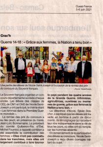 La remise de prix du concours 2021 du souvenir français s’est déroulée le jeudi 03 juin en présence de monsieur Jean-Loïc BONNEMAINS,, maire, accompagné par Monsieur Robert MALARD délégué du souvenir français pour la commune, de Marie-Chantal CARLIER chargé du suivi du concours scolaire, de JO LE ROL porte drapeau du comité et d’André LE VAILLANT, vice président.