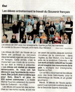 Le jeudi 02 mai, le comité à remis ses prix à la classe de CM1 de madame Sophie LE PORT. Le concours scolaire organisé en partenariat avec l’office national des anciens combattants (ONAC) et en collaboration avec la direction des services départementaux de l’éducation nationale (DSDEN) avait pour thème « le monument aux morts de votre commune ».