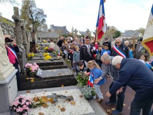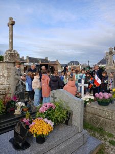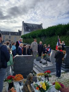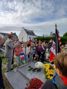 La cérémonie a débuté par le traditionnel dépôt de gerbes au cimetière sur la tombe de regroupement et les tomebs rénovées par le comité (tombe Jean Marie LE  BAYON et Julien LE SAUSSE. Devant le monument aux morts, Robert Malard a présenté le drame du FARFADET le 06 juillet 1905, sous-marin qui a coulé à peine sorti du port de Bizerte; Julien LE SAUSSE faisait partie de l’équipage.