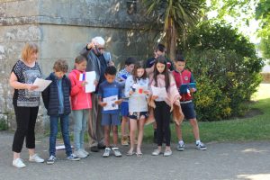 Les enfants entonnant le chant des partisans avec madame Sophie le Port directrice de l’école primaire des deux rivières et Robert Malard, notre délégué, préposé au micro