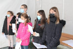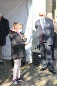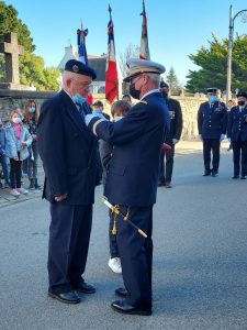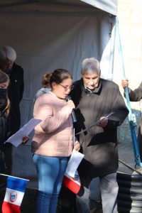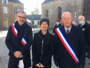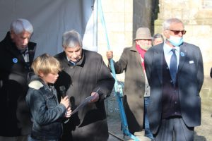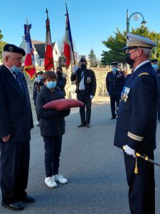 A Erdeven, la cérémonie a été présidée par monsieur Dominique RIGUIDEL maire, an présence du nouveau conseil municipal des jeunes. Au cours de la cérémonie monsieur Daniel LE FLOCH président la section UNC Erdeven-Belz-ETEL a été décoré de la médaille d’argent de la défense nationale avec la barrette essais nucléaires par le Lieutenant-Colonel (ER) Thierry LE DENMAT tous deux membres de notre comité du Souvenir Français. Parmi les 3 drapeaux présents il faut saluer et remercier plus particulièrement pour leur première, Xavier Le Bail et Maëlie, petite fille de Thierry LE DENMAT.