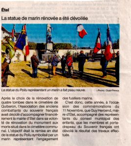 A Etel , Monsieur Guy HERCEND maire a souhaité lors de la cérémonie que le comité rappelle ses missions à l’occasion de l’action de rénovation du Monument aux Morts menée en commun. André Le VAILLANT accompagné de JO LE ROL porte-drapeau a ainsi rappelé les missions du Souvenir Français et l’action de rénovation du Fusilier marin participant ainsi à rendre un nouvel hommage appuyé aux 129 Morts pour la France inscrits sur le monument.