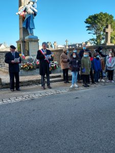 A Crac’h la cérémonie s’est déroulée en trois phases; la première a permis de rendre un hommage particulier aux 8 combattants morts pour la France (MPLF) inscrits sur le calvaire de Kercado, calvaire érigé par le Général de GOUVELLO pour les membres de sa famille et les soldats de deux villages proches de du château familial; la seconde s’est déroulée dans le cimetière communal avec la dépose de deux gerbes devant le monument dédiés aux MPLF et devant la tombe de regroupement pour 14 soldats MPLF. La troisième a conclu la matinée devant le monument aux morts avec en particulier la participation des enfants qui ont lus les biographies des soldats inscrits sur le calvaire et les biographies de trois femmes qui avaient été mises à l’honneur dans le dossier du concours scolaire de l’an dernier.