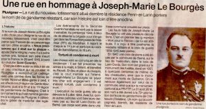 La municipalité de Pluvigner a décidé rendre hommage au Sergent-chef (gendarmerie) Joseph Marie le Bourgès. En poste à la gendarmerie de Pluvigner, il décide de rejoindre les Forces Françaises Libres et le maquis le 1er juin 1944 et participera aux combats de Saint Marcel (56). Fait prisonnier le 19 juin 1944 alors qu’il cherche à rejoindre sa famille. Après avoir été torturé et condamné à mort de façon expéditive, il est fusillé avec quinze autres résistants le 6 juillet 1944, au lieu-dit Lan dordu à Berné. Les corps furent enfouis dans une fosse.